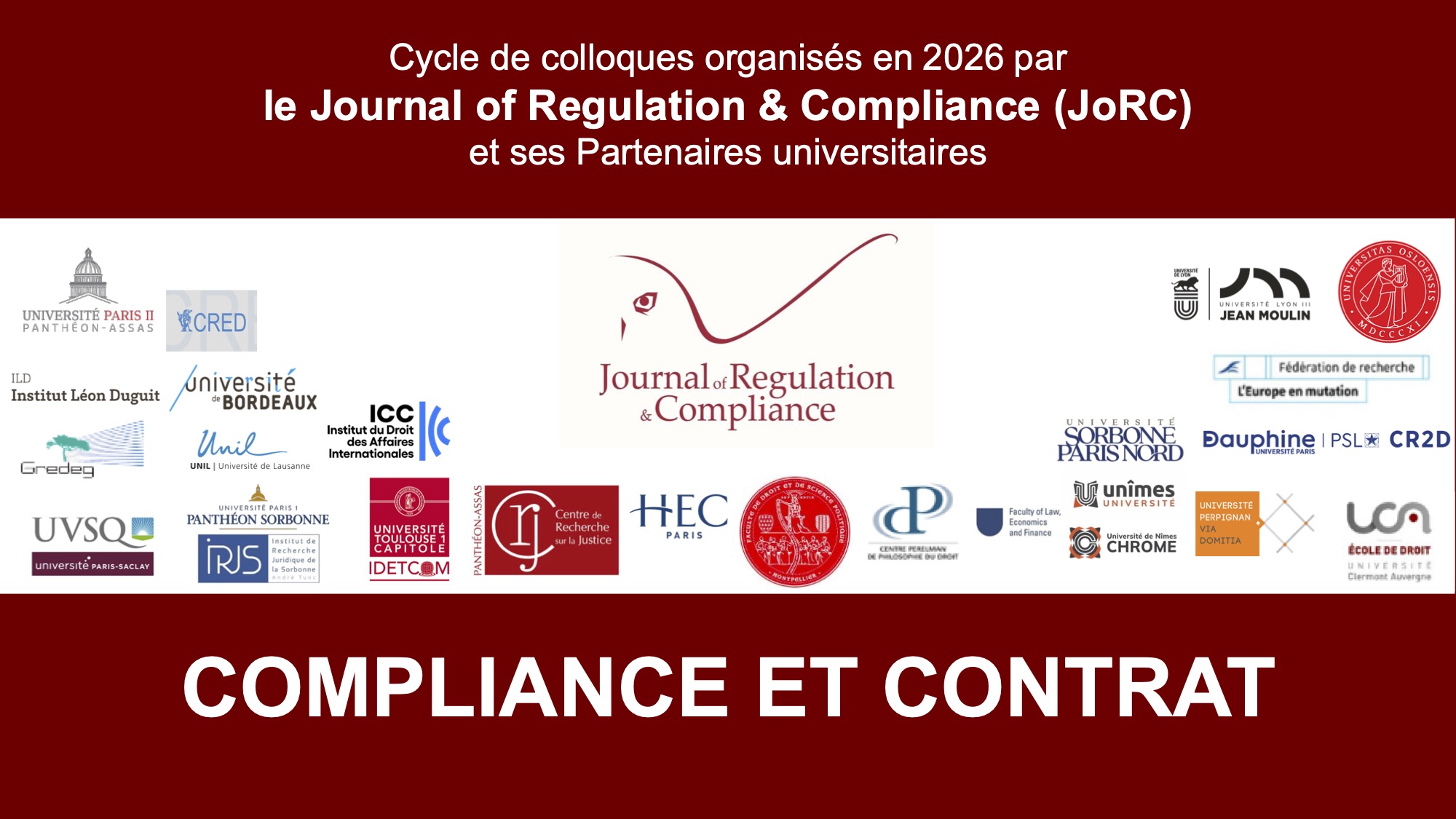 ► Le Cycle de colloques en quelques mots : Dans le prolongement direct du cycle précédent de colloques coorganisé entre le Journal of Regulation & Compliance et ses Universités partenaires sur « L’Obligation de Compliance », ayant servi de base à la publication de l'ouvrage 📕L'obligation de compliance, le cycle dont certains éléments débutèrent dès 2024 et d'autres sont déjà présents dans cet ouvrage approfondi le thème spécifique des liens entre le Droit de la Compliance et le Contrat. En effet, le Droit de la Compliance est souvent analysé comme la construction de lois et réglementations pour atteindre des « 📕Buts Monumentaux » de nature politique voulus par les États et les autorités publiques, à la concrétisation desquels les opérations économiques systémiques contribuent par des 📕Outils de Compliance aujourd’hui bien répertoriés. Le contrat est encore relativement peu étudié, voire peu développé, dans des systèmes de compliance souvent perçus à travers les ordres ainsi émis, les technologies mises en place et les 📕sanctions qu’il s’agit d’éviter ou d’endurer. Mais au contraire, l’avenir du Droit de la Compliance, notamment dans sa conception européenne qui met les êtres humains au centre du souci de durabilité des systèmes et dans l’usage des contrats est la nouvelle conception que l’on doit en avoir. Le contrat apparaît alors à la fois comme la modalité par laquelle l’entreprise assujettie exécute son obligation légale, tisse des relations avec d’autres acteurs et déploie les innovations requises. Le Droit des contrats est à la fois utilisé et renouvelé de ce fait. Le cycle de colloques envisage différents aspects de cette problématique générale. Il donnera lieu à la publication d’un 📕ouvrage fin 2026.